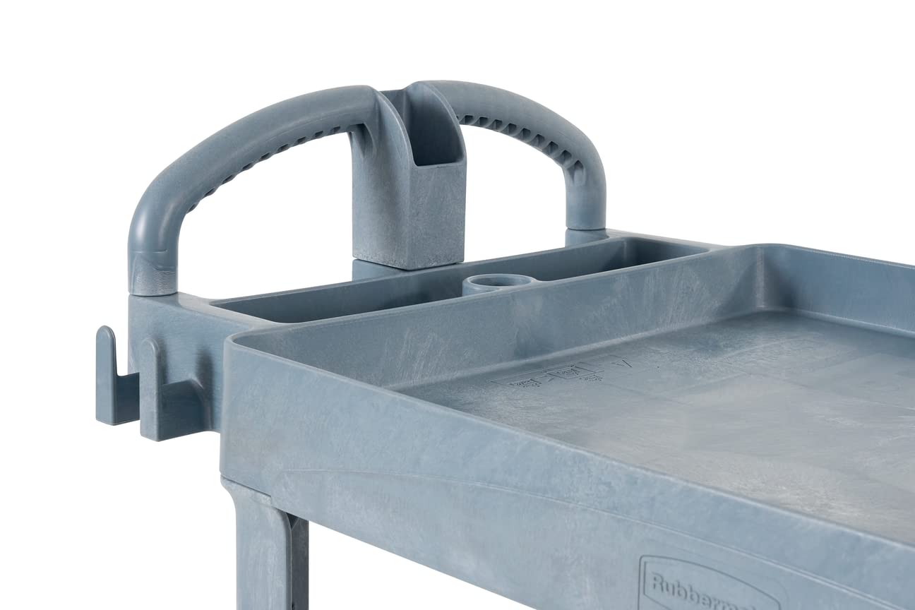 With handle compartments for additional storage, molded fittings for rolled supplies, an easy-access lipped bottom shelf, and a lipped top shelf, this is a versatile utility cart for any facility. With handle compartments for additional storage, molded fittings for rolled supplies, an easy-access lipped bottom shelf, and a lipped top shelf, this is a versatile utility cart for any facility.